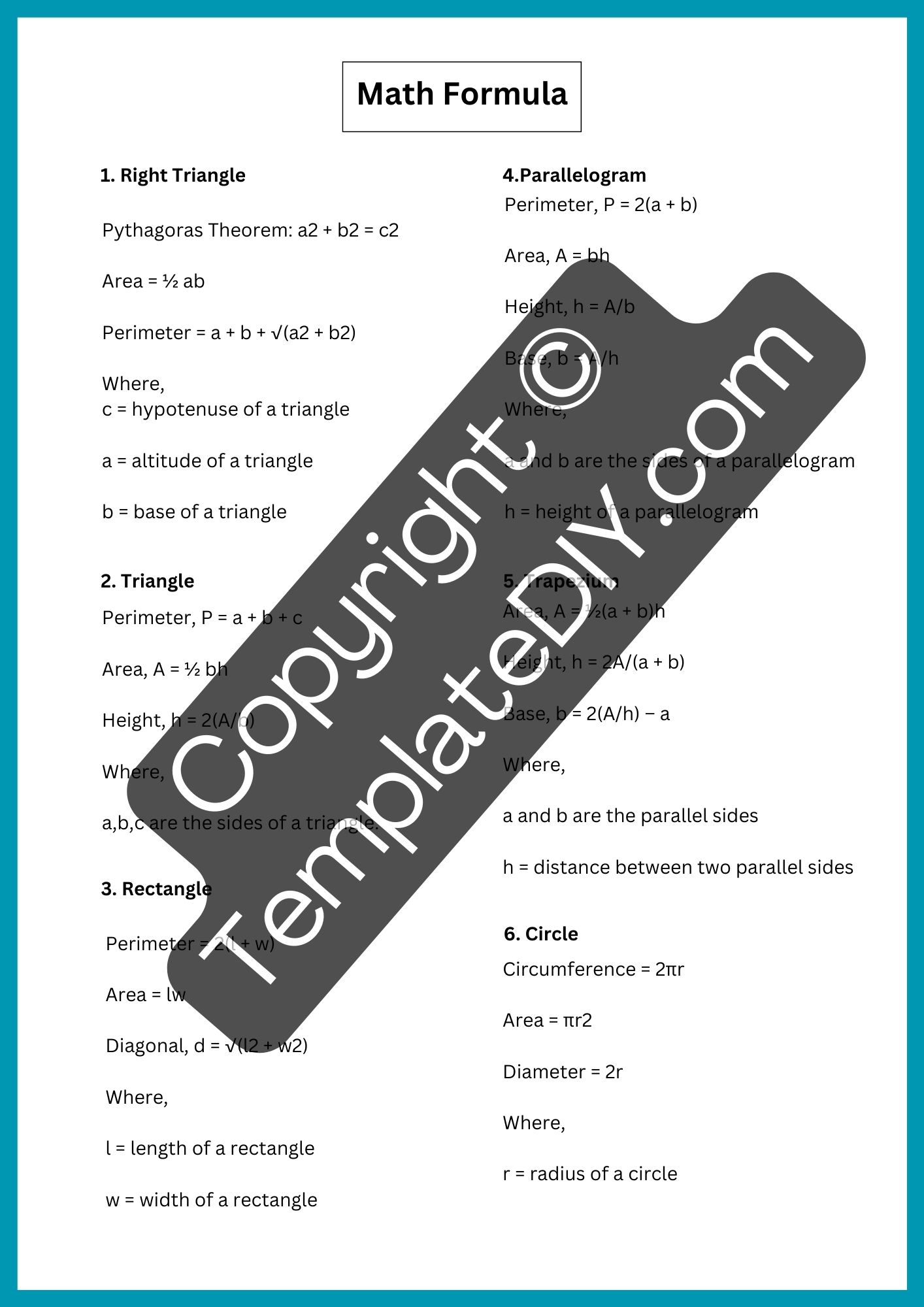 Printable Basic Math Formulas Chart Template in PDF and Word